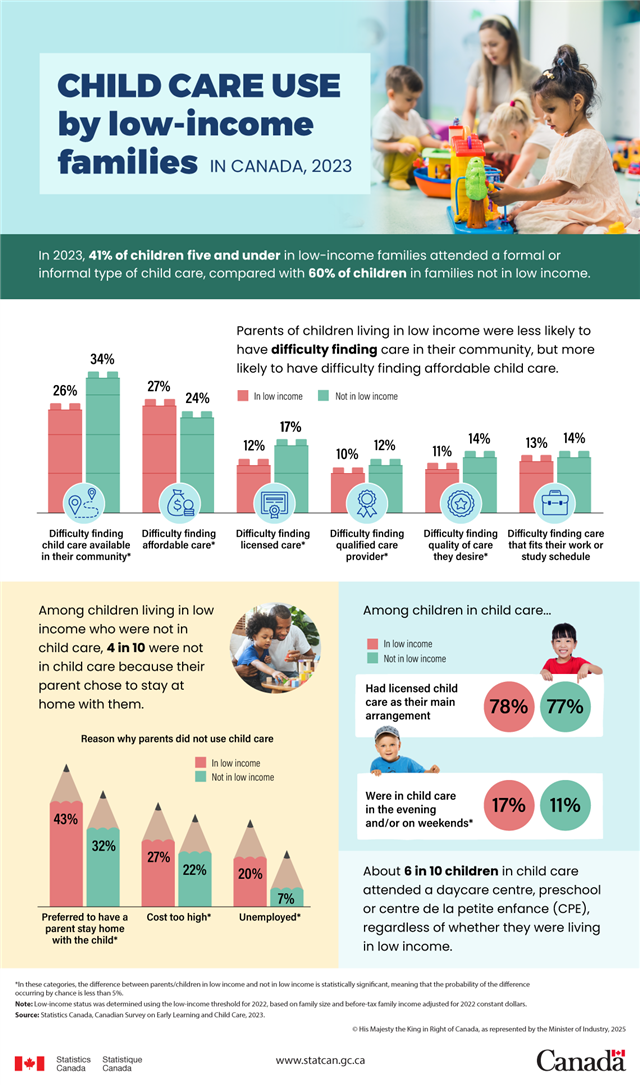 A new Statistics Canada report highlights key differences in child care use between low-income and higher-income families.