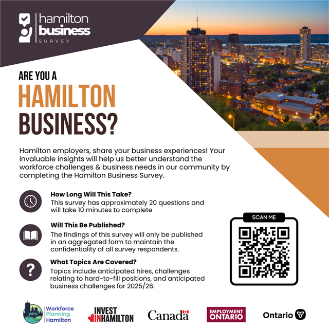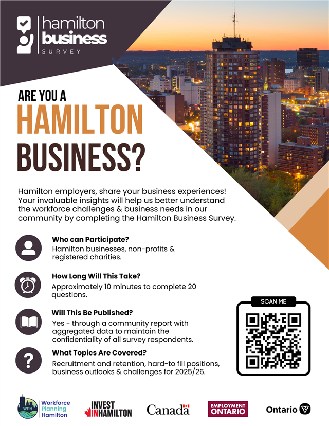 The Hamilton Business Survey invites local employers to share their experiences, challenges, and outlooks. Your insights play a critical role in helping Workforce Planning Hamilton and our partners better understand workforce needs, recruitment and retention pressures, and business conditions across the city.