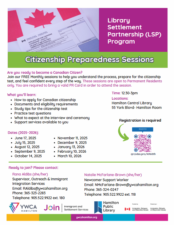 Thinking about becoming a Canadian citizen? Join our FREE monthly Citizenship Preparedness Sessions to build confidence and get ready for every step of the process—from applying to taking the test and attending the ceremony. These sessions are open to Permanent Residents (a valid PR card is required).