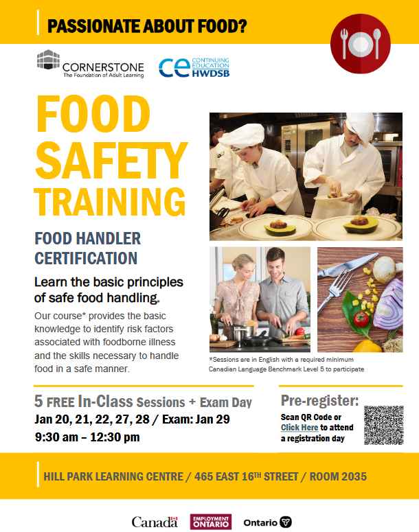 Hill Park Learning Centre is accepting registrations for its FREE Food Safety Training – Food Handler Certification Course. Spots are limited—see the attached flyer for full details.