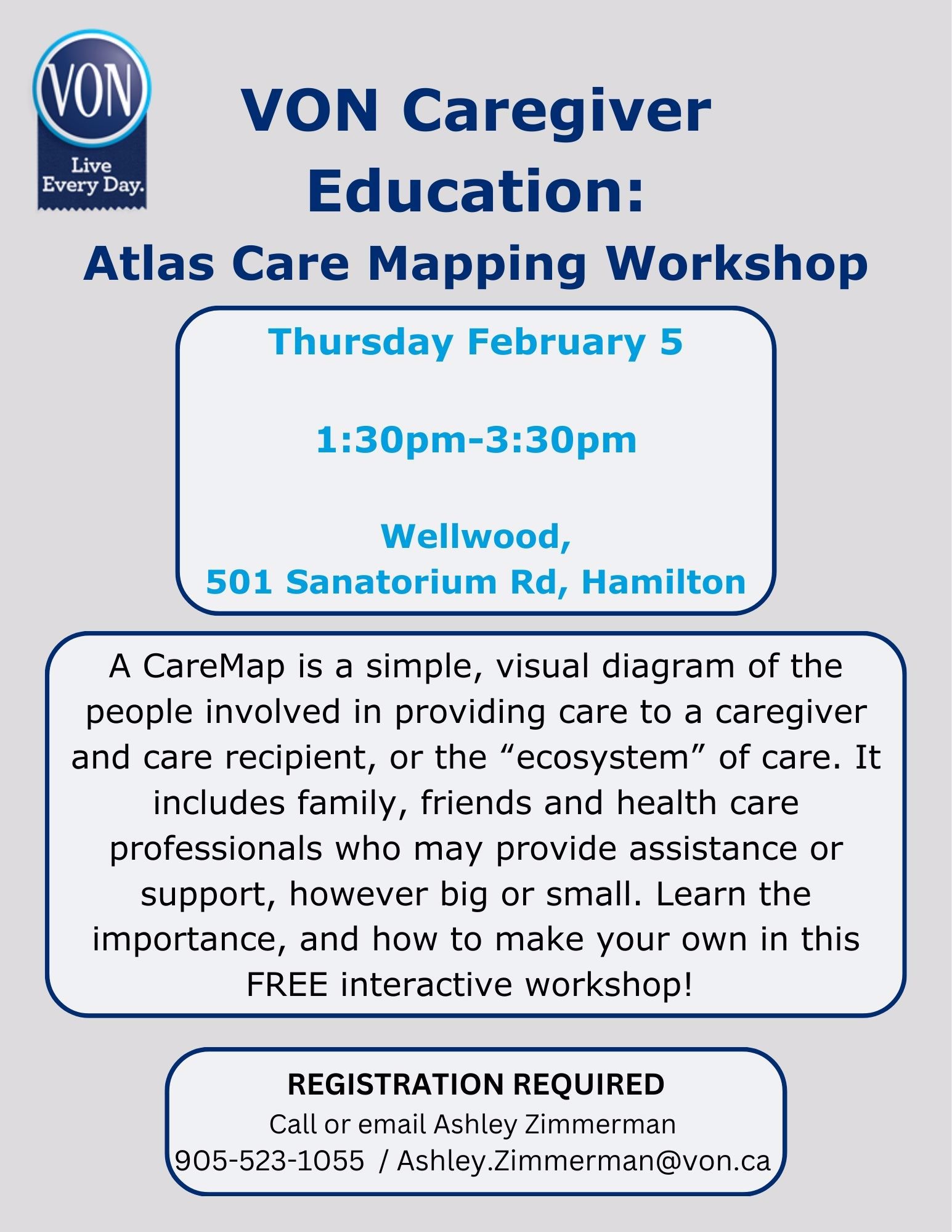 To register, call 905-523-1055 or email Ashley.Zimmerman@von.ca.