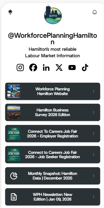 Check out our Linktree for one place to access everything you need from Workforce Planning Hamilton — from monthly snapshots and business survey results to data tools and community resources.