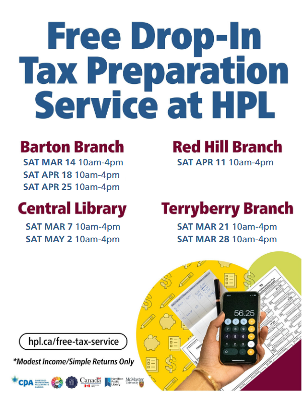 In light of this, I’m please to announce that the Hamilton Public Library—in partnership with the Community Volunteer Income Tax Program—are once again hosting tax clinics at select library branches throughout the city! These tax clinics are meant for individuals and families with a modest income. Due to considerable challenges with both funding and with securing volunteers, HPL are only able to offer drop-in tax clinics this year. These tax clinics are all going to take place on Saturdays between March 7 and May 2. These clinics are all FIRST-COME, FIRST-SERVED and there will be NO APPOINTMENTS.